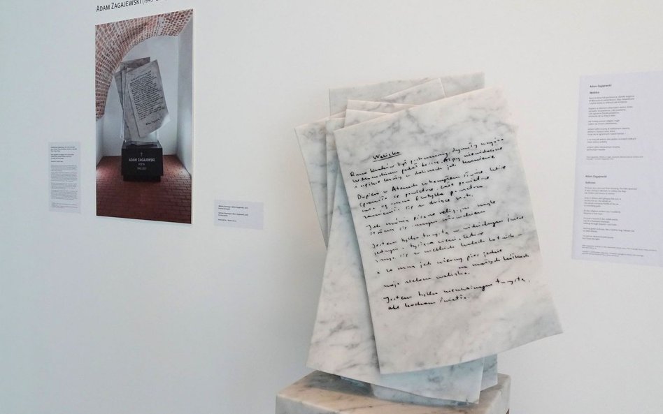 Na marmurowych kartkach wygrawerowany został wiersz „Spróbuj opiewać okaleczony świat” z autografu napisanego ręką poety. Po zamachu 11 września powstały wcześniej wiersz opublikował tygodnik „The New Yorker”, o czym Adam Zagajewski mówił w wywiadzie dla „Tygodnika Powszechnego”: - Myślę, że ten wiersz wybrano, bo jest w nim paradoksalne połączenie impulsu opiewania świata z żałobą z powodu faktu, że ten świat został jednak zraniony. Dla mnie on jest zawsze trochę okaleczony i przez komunizm, i, wcześniej, przez wojnę i różne nasze niedostatki historyczne. Dla Amerykanów świat stał się okaleczony dopiero od 11 września. Wcześniej już zdołali zapomnieć o innych okaleczeniach.