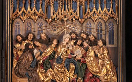 Ta scena zajmuje centralną partię ołtarza. Matka Boża jest wciąż młoda (starzenie jest jednym ze skutków grzechu pierworodnego), zdaje się osuwać na kolana, po-grążona w modlitwie. Wpół-omdlałą, podtrzymuje jeden z apostołów, prawdopodobnie święty Jakub. Obok zgromadzili się pozostali uczniowie Chrystusa.