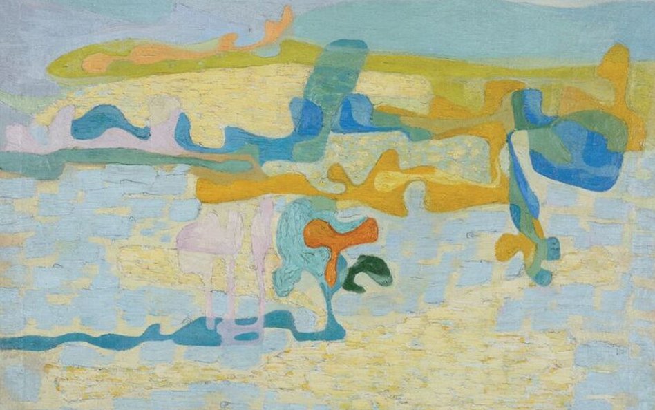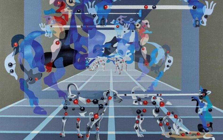 Skoro o Krygierze mowa. Wybór jego obrazów otwiera „Pejzaż z Bierutowic” (1949), noszący wyraźne piętno unistycznej koncepcji Strzemińskiego. Ale z biegiem lat były uczeń wypracował własną poetykę, dochodząc do rozwiązań rodem z surrealizmu – czego dowodem „Symultanizm form”(1991), kompozycja oszałamiająca iluzyjną przestrzenią, w której kłębią się kształty obłe, organiczne, u podstawy obrazu przekształcające się w… psy.