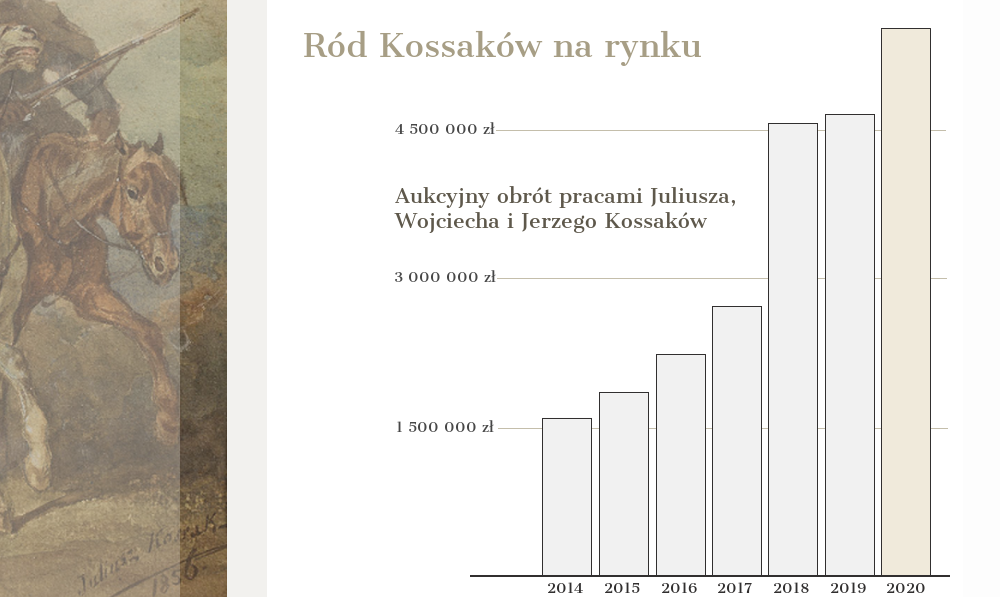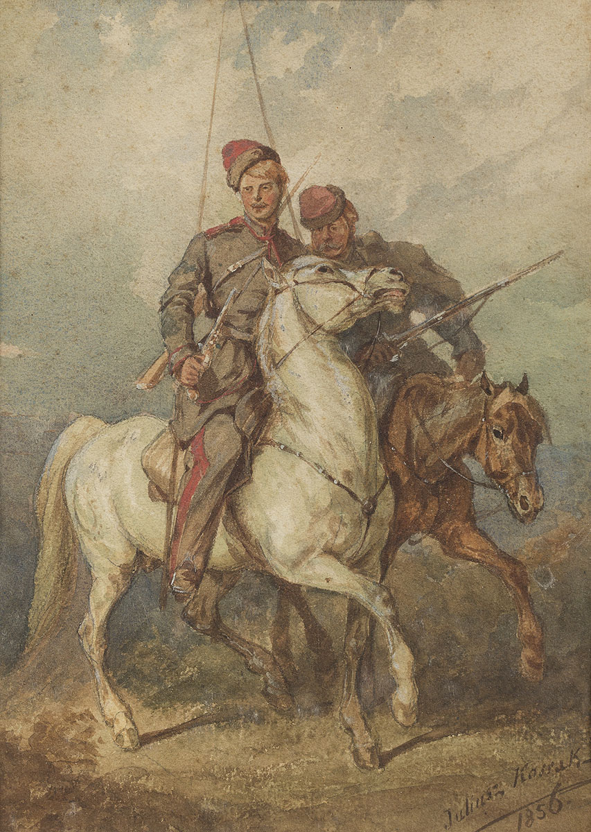 Juliusz Kossak przyszedł na świat jesienią, w latach 20. XIX wieku, zapoczątkowując unikalną w polskiej historii sagę - malarską w linii męskiej, a w kobiecej literacką. Syn Juliusza Wojciech kontynuował artystyczną działalność ojca, podobnie wnuk Jerzy, którego siostrami były pisarki Maria Pawlikowska-Jasnorzewska i Magdalena Samozwaniec. „Dwa Kozacy konno”, którzy trafią na nadchodzącą aukcję w Polswiss Art, przywołują więc odbiorcy losy jednego z największych wirtuozów narodowego malarstwa - narodowego, co istotne, w duchu zupełnie nieskażonym. Patriotyzm w twórczości Kossaków wcale nie sprowadzał się do rozdętej od patosu, nadużytej martyrologii, tylko do starannego odtwarzania detali i obyczajów: kostiumów, pejzażu, zmęczenia wojaków i lekkości rzucanych na Wisłę wianków.