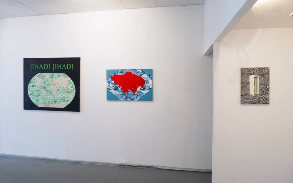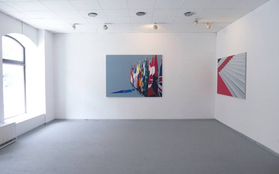 Obrazów na wystawie jest kilkanaście, ale każdy z nich jest solidnym materiałem do przemyśleń, zaproszeniem widza do refleksji. Kiedy na jednym z największych pokazywanych obrazów czyli „Upadku” (150x200) spośród długiego ustawionych w szyku (choć jak się mu przyjrzeć – niedoskonałym) flag państw - jedna leży – wygląda jakby pozostałe biernie się temu przyglądały. W dodatku choć flagi są całkowicie realnie przedstawione, to jednak płótna zapełnione barwami i symbolami zwisają w sposób uniemożliwiający ich identyfikację. Zatem, która leży? Dlaczego leży?