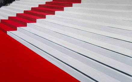 Kiedy z kolei oglądamy – także monumentalne „Schody” – widzimy zapełnioną nimi całą przestrzeń płótna. Białe stopnie z rozpostartym na środku czerwonym chodnikiem i leżącym u ich stóp dywanem – namalowane zostały w taki sposób, że z im bliższej odległości im się przyglądamy, tym większe widzimy szpary między białymi stopniami…