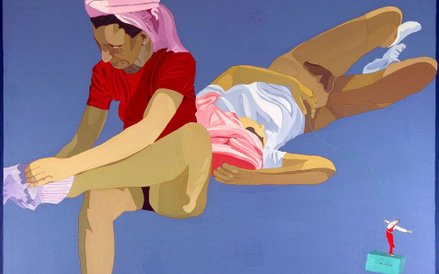 Malarka umieszcza postacie często na jednolitym neutralnym barwnym tle, usuwając detale, które osadzałyby obraz w natychmiast rozpoznawalnym miejscu czy krajobrazie. Za to wprowadza pewne  uzupełniające kolażowe elementy – wycięte reprodukcje czy fotografie, prowokując grę wyobraźni, poszerzającą pole skojarzeń i refleksji.