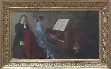 - „Przy fortepianie” jest wczesnym, bardzo rzadkim dziełem malarza, choć od dzieciństwa zajmował się także twórczością portretową. Przedstawia dwie siostry Jacka Malczewskiego w trakcie muzykowania – młodszą Helenę grającą na fortepianie i starszą Bronisławę. Namalowany został po powrocie 23-letniego artysty z Paryża, gdzie kształcił się w francuskiej szkole sztuk pięknych. Dzieło ma prywatny charakter, pokazuje codzienne życie w radomskim domu artysty. Na jego odwrocie znajduje się napis: „Jacek Malczewski Radom 1877” - mówi dr hab. Agnieszka Rosales Rodríguez, kurator Galerii Sztuki XIX wieku i Zbiorów Sztuki Polskiej do 1914 roku.