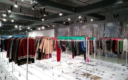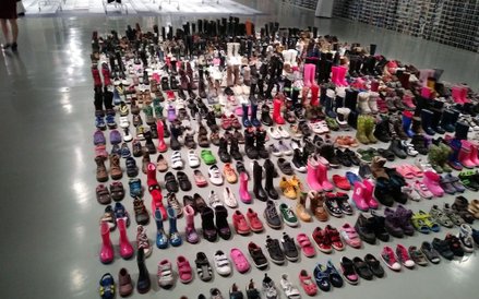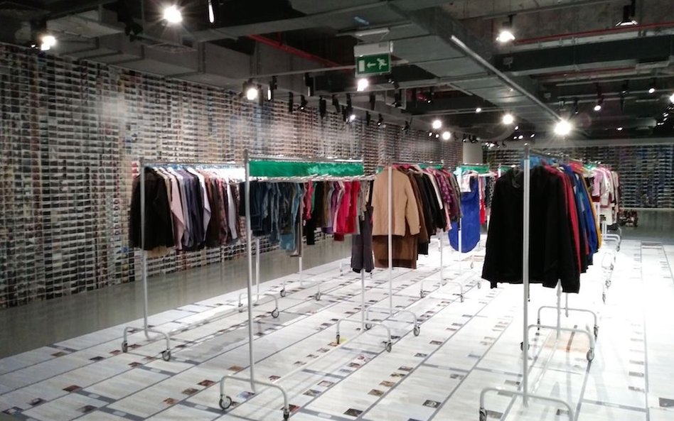 Na środku pomieszczenia ok. 2 tys. części garderoby – rozwieszonych schludnie na wieszakach wypranych ubrań i ustawionych jeden obok drugiego butów. Wiele nie do pary.