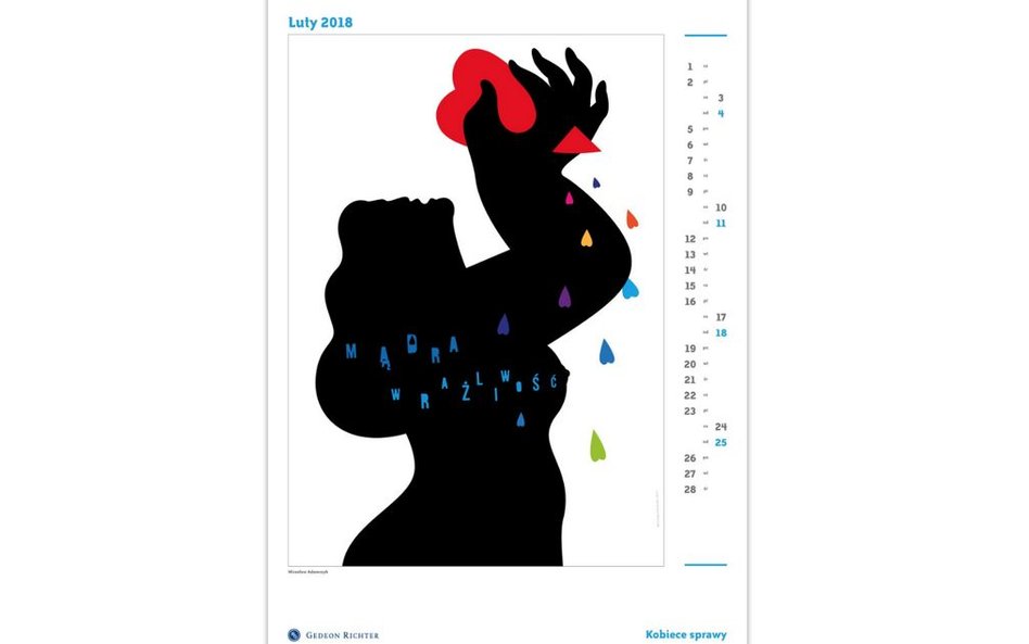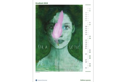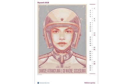 Efekt bywa zaskakujący. Kobieta dziś musi sprostać tylu wymaganiom i oczekiwaniom oraz pogodzić nieraz sprzeczne role, że musi być osobą o niezwykłej mocy: bizneswoman, czyli nowym typem siłaczki albo bohaterką rodem ze science fiction lub literatury fantasy. Nic dziwnego, że styczeń otwiera wcielenie kobiety – cyborga Bartosza Kosowskiego, bo przecież przed nią cały rok nieznanych, zapewne też trudnych zadań. Artysta wizerunek tej mimo wszystko uwodząco pięknej kobiety uzupełnia kpiącym hasłem, jak z czasów socu: „Zawsze atrakcyjna i co ważne, szczęśliwa”.