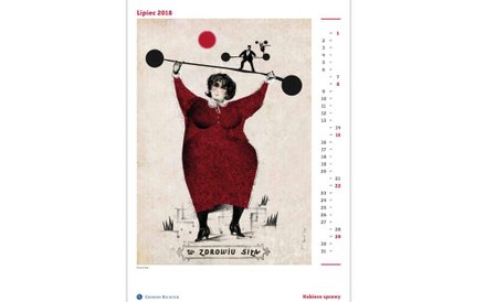 Z kolei sympatyczna sztangistka wagi ciężkiej na plakacie Ryszarda Kaji (lipiec) macha sztangą jak piórkiem, na której unosi całą rodzinę. A „Super kobieta” Mieczysława Wasilewskiego (listopad), nakreślona kilkoma prostymi liniami, łączy kobiecy wdzięk z wcieleniem powszechnego w popkulturze ideału Supermana. Cechy liderki czy bizneswoman znakomicie oddaje plakat Tomasz Bogusławskiego (kwiecień). Artysta osiągnął w nim perfekcyjna syntezę znaku. Zamiast kobiecej postaci mamy tu torebkę – but na wysokim obcasie, a jednocześnie ze sznurówką, która ubezpiecza nawet najbardziej ryzykowny krok.