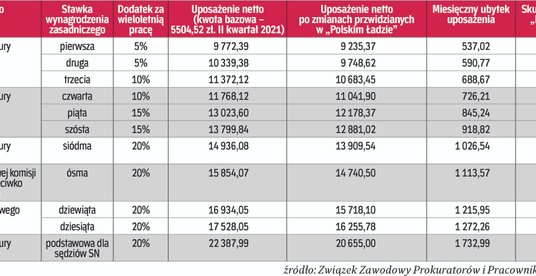 W środowisku prokuratorów i sędziów krąży od kilku dni tabela, przygotowana przez Związek Zawodowy Prokuratorów i Pracowników Prokuratury, zawierająca wyliczenie obniżki ich wynagrodzeń po zmianach przewidzianych w Polskim Ładzie.