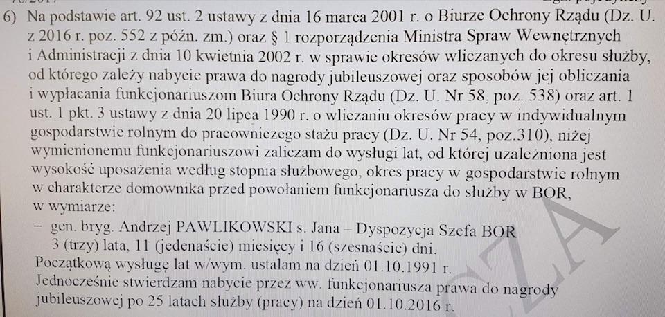 "Nie byłoby w tym nic kontrowersyjnego gdyby nie fakt, że w tym samym czasie, trzy lata przed rozpoczęciem służby w BOR, Pawlikowski studiował na politechnice w Krakowie. Obronił się w 1994 r. Dzięki tej decyzji gen. Andrzej Pawlikowski, który w kwietniu odszedł na emeryturę uzyskał najwyższy przelicznik wysługi lat – 2,6 proc. Studia dają zaledwie 0,7 proc. Generał Pawlikowski w BOR przepracował w sumie 17 lat (z sześcioletnią przerwą) ma 25 lat służby i według informacji „Rzeczpospolitej” pełną wysługę emerytalną. Od maja dostaje ok. 10 tys. zł świadczenia” - napisaliśmy.