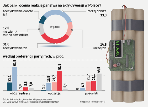 Krytyczni są ci, którzy w ostatnich wyborach parlamentarnych oddali głos na Prawo i Sprawiedliwość (80 proc.) i Konfederację (62 proc.), a dobrą opinię mają wyborcy Koalicji Obywatelskiej (79 proc.), Nowej Lewicy (73 proc.) oraz Trzeciej Drogi (72 proc.). Widoczna jest też polaryzacja wśród wyborców, którzy uczestniczyli w ostatnich wyborach prezydenckich, ale z jedną niespodzianką. Otóż źle oceniają działania instytucji państwowych w obliczu ujawnionej dywersji wyborcy Karola Nawrockiego (87 proc.), Sławomira Mentzena i Adriana Zandberga (po 55 proc. wskazań), a dobrze wyborcy Rafała Trzaskowskiego (85 proc.), Szymona Hołowni (82 proc.), Magdaleny Biejat (66 proc.), a także... Grzegorza Brauna (54 proc.). Ci ostatni rządu nie popierają, prezentują też postawę antyukraińską i prorosyjską.