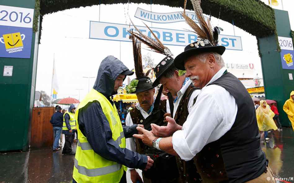 Przy wejściu na teren festynu stoją w długiej kolejce Siegfried Nuernberg i Sarah Schmidt. Na stoisku, gdzie można deponować bagaż już o 10-tej rano jest ciaśniej niż zwykle. Sarah Schmidt wolałaby wziąć torbę ze sobą, ale jest ona za duża. W tym roku obowiązuje żelazna zasada: torba, do której zmieszczą się więcej niż trzy litry mleka, nie może być wniesiona na teren festynu. Podobnie jest z plecakami. – To niewygodne – mówi Siegfried Nuernberg. – Ale zrozumiałe po wszystkich tych zamachach – dodaje jego partnerka. Pierwszy raz na monachijskim święcie piwa obowiązują w tym roku kompleksowe kontrole wstępu. Pierwszy raz też cały teren festynu – Theresienwiese – jest ogrodzony, aby wszyscy odwiedzający korzystali z oficjalnego wejścia.