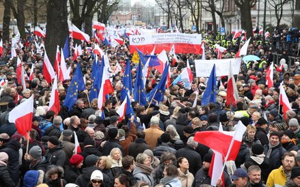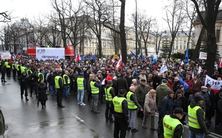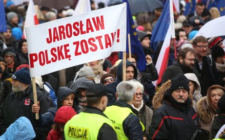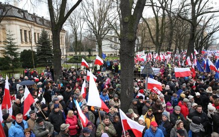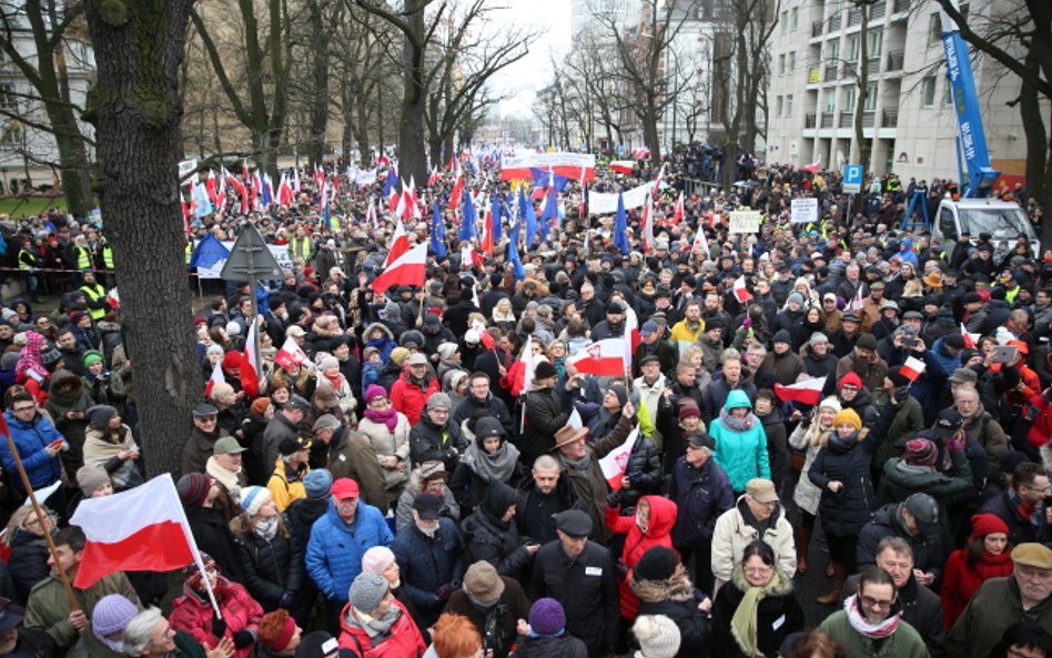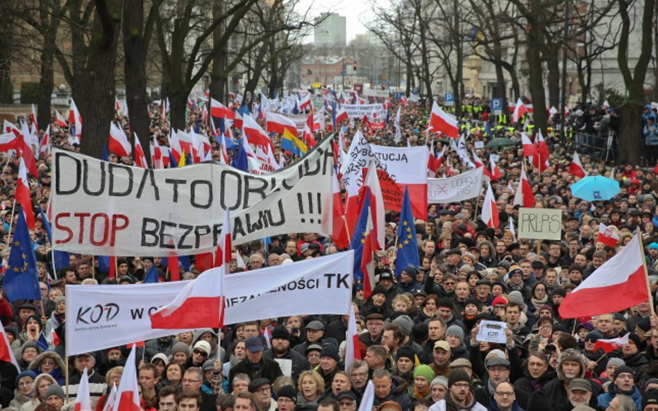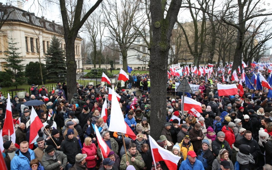 Tłum, szacowany wstępnie na ok. 15 tysięcy osób, skandował "Obronimy demokrację!", "Obronimy konstytucję!" i "Niezawisłość Trybunału!".