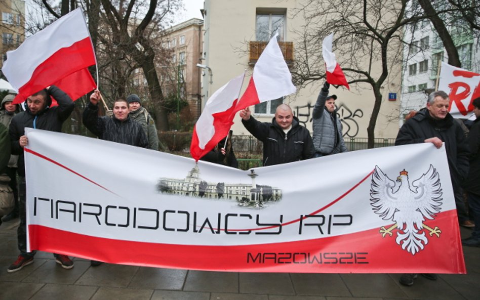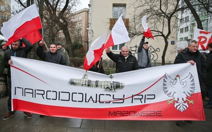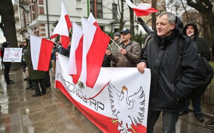 Przed gmachem Trybunału Konstytucyjnego już od godziny 11 zbierali się narodowcy, przeciwnicy demonstracji KOD. Uzbrojeni w megafony zamierzają zagłuszyć uczestników marszu "Obywatele dla demokracji", skandują hasła "Bóg, Honor i Ojczyzna", "Sierpem i młotem czerwoną hołotę" oraz "Miejsce lewicy na szubienicy".