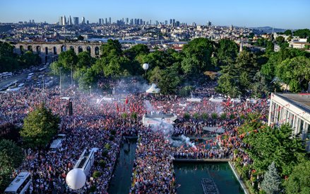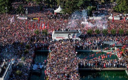 Przed ratuszem w Stambule zebrał się tłum mieszkańców, aby obserwować inaugurację nowego burmistrza Ekrema Imamoglu. Jego zwycięstwo po raz pierwszy od lat wzmocniło turecką opozycję.