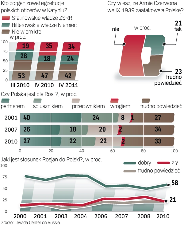 27 proc. badanych widzi w naszym kraju normalnego partnera. 22 proc. – sojusznika. Dla 17 proc. nasz kraj jest przeciwnikiem. Za wroga uważa Polskę tylko 2 proc. Rosjan. W porównaniu z wynikami z 2001 r. oceny znacznie się pogorszyły – wówczas za normalnego partnera uważało Polskę 40 proc. Rosjan.