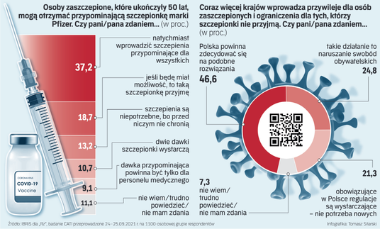 Za jak najszybszym wprowadzeniem trzeciej dawki dla wszystkich grup wiekowych opowiada się 13,2 proc. ankietowanych, a 37,2 proc. twierdzi, że jak tylko będą mieć możliwość, to zaszczepią się po raz trzeci. Co dziesiąty ankietowany uważa, że trzecia dawka powinna być podana przede wszystkim personelowi medycznemu.