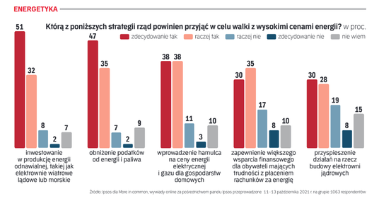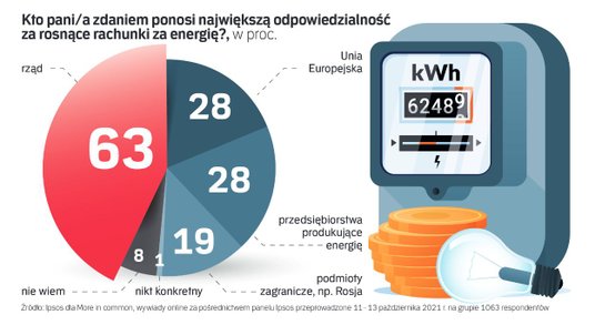 Jak wynika z badania, 63 proc. respondentów wskazało, że to rząd odpowiada za ceny energii. 28 proc. za głównego winowajcę uznało Unię Europejską, 28 proc. – przedsiębiorstwa produkujące energię, 19 proc. – podmioty zagraniczne, w tym Rosję. W sondażu można było wskazać więcej niż jedną odpowiedź.