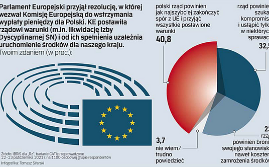 IBRiS na zlecenie „Rzeczpospolitej" zapytał respondentów o reakcje na pogorszenie relacji z Unią: „Parlament Europejski przyjął rezolucję, w której wezwał Komisję Europejską do wstrzymania wypłaty pieniędzy dla Polski. KE postawiła zaś polskiemu rządowi warunki (m.in. likwidację Izby Dyscyplinarnej SN) i od ich spełnienia uzależnia wypłatę środków".
