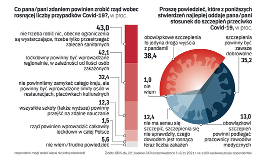 Nastroje społeczne wokół pandemii to jeden z powodów, dla których rząd, mimo ogromnych zwyżek zakażeń, nie podejmuje decyzji o obostrzeniach. – Rozważamy różnego rodzaju mechanizmy, które mogą zmniejszyć natężenie transmisji wirusa, ale nie rozważamy lockdownu – mówił w sobotę premier Mateusz Morawiecki. Jak tłumaczył, rząd „nie chce postępować wbrew bardzo dużej części opinii publicznej" i nie będzie wprowadzać obostrzeń dla niezaszczepionych. Zwrócił także uwagę na to, że obostrzenia wprowadzone w innych państwach nie ograniczają skali pandemii.
