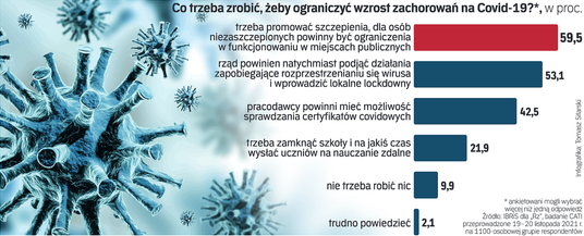 A jak wynika z sondażu IBRiS przeprowadzonego na zlecenie „Rzeczpospolitej", aż 59,5 proc. ankietowanych oczekiwałoby właśnie promocji szczepień i wprowadzenia paszportów covidowych i związanych z tym ograniczeń dla osób niezaszczepionych. Wśród zwolenników takiego rozwiązania najwięcej jest wyborców Koalicji Obywatelskiej i Lewicy – po 77 proc. Wśród wyborców PiS popiera to 63 proc. ankietowanych. Zwolennicy tego rozwiązania są także wśród elektoratu sceptycznej wobec pandemii Konfederacji – 43 proc. popiera to rozwiązanie.
