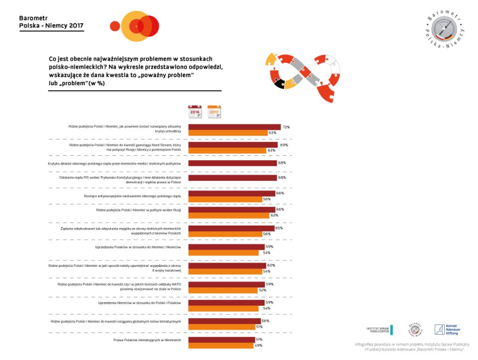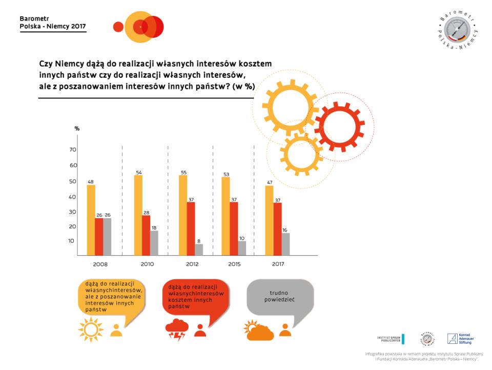 - W ostatnich dwóch latach – w porównaniu z 2015 rokiem – odsetek pozytywnych ocen nieznacznie się zmniejszył, ale w wielu wypadkach nie wzrosła jednocześnie liczba opinii negatywnych lub wzrost ten był niewielki. Zwiększyła się jednak grupa badanych, którzy nie udzielają konkretnej odpowiedzi. Wątpliwości te w sytuacji możliwego wzmożenia antyniemieckiej retoryki w Polsce mogą się przekształcić w opinie negatywne - komentuje wyniki dr Agnieszka Łada, dyrektor Programu Europejskiego Instytutu Spraw Publicznych, autorka badań.