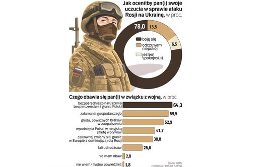 Wśród badanych występują też obawy o rozwój sytuacji w dłuższej i globalnej perspektywie. 41,7 proc. badanych boi się „wpadnięcia Polski w rosyjską strefę wpływów", a 38,8 proc. „całkowitej zmiany sił i granic w Europie z dominującą rolą Rosji". Te obawy podzielane są też wyraźnie przez międzynarodową opinię publiczną, także w państwach położonych daleko od działań wojennych. A presja obywateli, by rządy podejmowały radykalne środki przeciw Putinowi i Rosji – wzrasta.