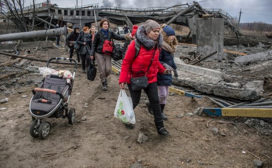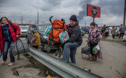 Mieszkańcy Irpienia, trzymając dzieci, bagaże i zwierzęta domowe, przemieszczali się po chodnikach do czekających na nich autobusów i samochodów, które zabiorą ich dalej od miejsca starć.