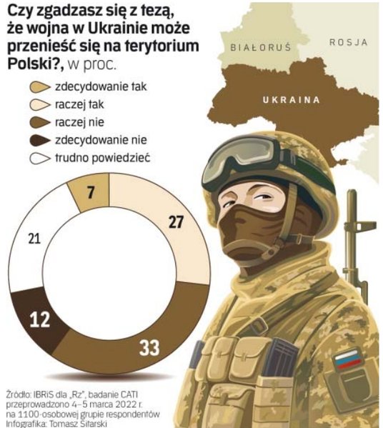 Z badania przeprowadzonego na zlecenie „Rzeczpospolitej” przez IBRiS wynika, że 45 proc. respondentów zakłada, iż wojna na Ukrainie nie przeniesie się na terytorium Polski, przeciwnego zdanie jest 34 proc. ankietowanych, co piąty pytany nie ma na ten temat zdania.