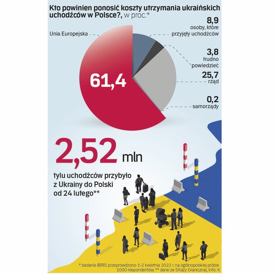 Kto? Zdaniem badanych przez IBRiS środki na pomoc powinny przede wszystkim pochodzić z Unii – uważa tak 61,4 proc. respondentów. 26,7 proc. wskazuje rząd, 8,9 proc. osoby prywatne przyjmujące uciekinierów z Ukrainy, 0,2 proc. obarczyłoby tym obowiązkiem samorządy, a niespełna 4 proc. nie wie, kto powinien wyłożyć pieniądze. Gdyby jednak w takiej właśnie proporcji rzeczywiście pomoc była finansowana, wyglądałoby to całkiem nieźle.