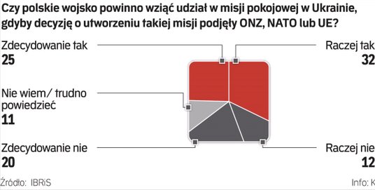 Tak wynika z badania przeprowadzonego przez IBRiS na zlecenie „Rzeczpospolitej”. Za udziałem polskich żołnierzy w misji pokojowej w Ukrainie opowiedziało się 56,8 proc. badanych, przeciwnego zdania było 32,5 proc., a nie miało zdania 10,7 proc.