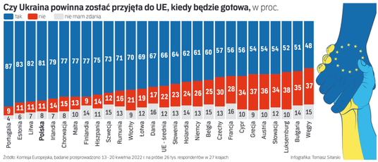 Ten sondaż długo pozostanie w pamięci europejskich polityków, którym przyjdzie decydować o losie Ukrainy. Bo przynosi tektoniczne zmiany. Państwo, które tak niedawno z perspektywy Rzymu czy Paryża nie mieściło się w kręgu zachodniej cywilizacji, teraz w ocenie większości respondentów w krajach „27” biorących udział w sondażu Komisji Europejskiej, powinno, jak tylko „będzie gotowe”, dołączyć do Unii. Tak sądzi 66 proc. ankietowanych, podczas gdy trzykrotnie mniej (22 proc.) jest przeciwnego zdania.