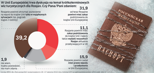 Zdecydowana większość badanych przez IBRiS (71,1 proc.) opowiada się za ograniczeniem prawa do wjazdu na teren Unii Europejskiej obywatelom Rosji. Z tego 31,9 proc. opowiada się za bezwzględnym zakazem wjazdu, a 39,2 proc. badanych uważa, że „Rosjanie powinni otrzymywać pozwolenie na wjazd do krajów Unii tylko w wyjątkowych sytuacjach (np. pogrzeb kogoś z rodziny)”. 11,1 proc. skłania się do poglądu, że Rosjanie nie tylko powinni mieć zakaz podróżowania do krajów UE, ale należy z niej także wydalić wszystkich „aktualnie tam przebywających”. Tylko 15,9 proc. respondentów jest zdania, że obywatelom Rosji nie powinno odbierać się prawa podróżowania do UE.