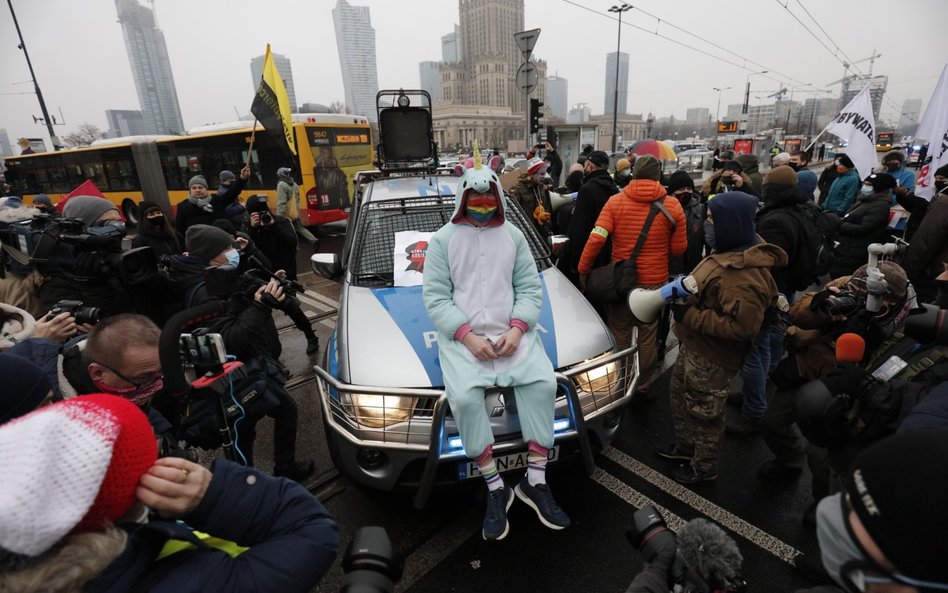 "Na skrzyżowaniu ulic Zajączka i Mickiewicza grupa protestujących zaatakowała policjantów. Na miejsce skierowano pododdział zwarty. Sytuacja została opanowana. Trwają czynności w kierunku naruszenia nietykalności cielesnej policjanta" - poinformowała stołeczna policja.
