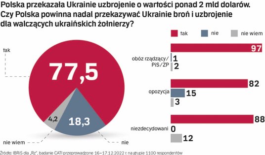 Z badania IBRiS wynika, że za przekazywaniem broni i uzbrojenia dla ukraińskich żołnierzy jest 77,5 proc. badanych, przeciwko – 18,3 proc., a tylko 4,2 proc. nie ma zdania. W równie wysokim stopniu za taką pomocą są zwolennicy Zjednoczonej Prawicy (97 proc.), opozycji (82 proc.), jak i niezdecydowani (88 proc.). Za są głównie osoby starsze, (powyżej 60. roku życia), mieszkańcy małych miast, z rodzin wielodzietnych. To przeważnie słuchacze Wydarzeń Polsatu oraz TVP Info (po 86 proc.).