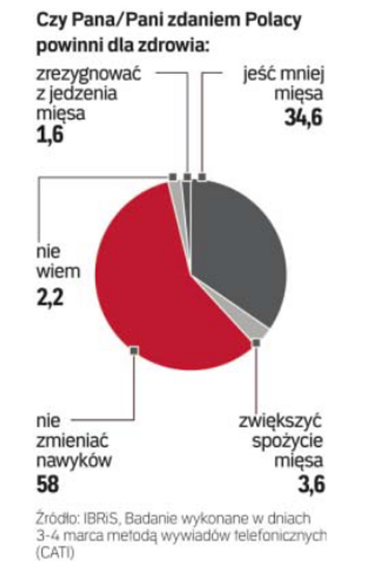Polacy nie chcą, by ktoś z zewnątrz wpływał na ich decyzje wiązane z jedzeniem. Z sondażu IBRiS dla „Rzeczpospolitej” wynika, że zaledwie 1,6 proc. ankietowanych uważa, że Polacy powinni dla zdrowia zrezygnować z jedzenia mięsa. Niespełna 35 proc. jest zdania, że powinni jego ilość ograniczyć.