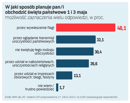 Z badania przeprowadzonego przez IBRiS na zlecenie „Rzeczpospolitej” wynika, że święta 1 i 3 maja obchodzimy w sposób symboliczny – wywieszając flagę z barwami narodowymi. Tak wskazują przeważnie wyborcy obozu władzy (71 proc. wskazań), określający się jako osoby o poglądach bardziej prawicowych. To głównie odbiorcy kanału informacyjnego TVP Info (76 proc.). Niewątpliwie wpływ na taką postawę ma prowadzona od kilku lat kampania społeczna organizowana m.in. przez biuro „Niepodległa” i ustanowiony w 2004 r. Dzień Flagi.