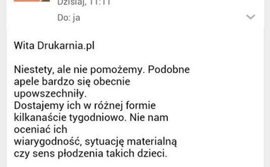 Pracownik drukarni odmówił, argumentując swoją decyzję coraz częstszymi zgłoszeniami o podobnym charakterze. Przedstawiciel firmy dodał również, że nie im pozostaje ocena "sytuacji materialnej i sensu płodzenia takich dzieci". Słowa te z oburzeniem przyjęli internauci.