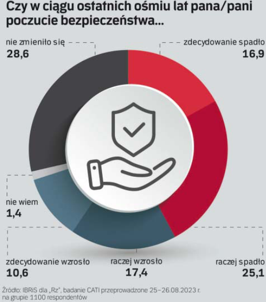 Tylko 28 proc. badanych przez IBRiS uważa, że poczucie bezpieczeństwa wzrosło. Taką opinię prezentują przeważnie zwolennicy obozu rządzącego (72 proc.), 40-latkowie (46 proc.), mieszkańcy wsi (37 proc.), osoby z wykształceniem podstawowym (36 proc.), deklarujący się jako zwolennicy prawicy (48 proc.), dobrze oceniający swoją sytuację finansową (39 proc.). Cztery lata temu głosowali głównie na PiS (63 proc.), a w wyborach prezydenckich w 2020 r. – na Andrzeja Dudę (58 proc.).