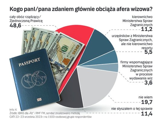 Według sondażu IBRiS przeprowadzonego na zlecenie „Rzeczpospolitej” i RMF FM największa grupa badanych obarcza odpowiedzialnością za aferę wizową cały obóz władzy – uważa tak 48,6 proc. respondentów. Kolejne 11,2 proc. wskazuje, że winne jest kierownictwo Ministerstwa Spraw Zagranicznych.