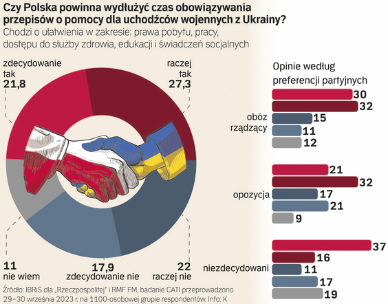 Przeciwni przedłużaniu pomocy dla uchodźców z Ukrainy są w większości wyborcy partii opozycyjnych, a nie PiS - wynika z sondażu IBRiS dla "Rzeczpospolitej".