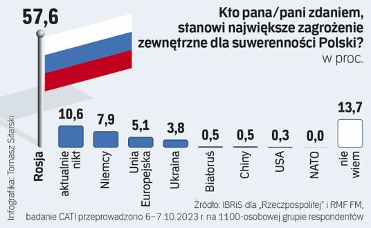 Z odpowiedzi respondentów wynika, że głównie postrzegają oni zagrożenie ze strony Rosji (57,6 proc. wskazań). W równym stopniu, bo po 55 proc., tak uważają zarówno wyborcy obozu rządzącego, czyli PiS, jak opozycji. Ponad 10,6 proc. uznało, że nikt nam nie zagraża. Co ciekawe, tak myślą głównie wyborcy opozycji (18 proc.), a obozu władzy tylko 1 proc.
