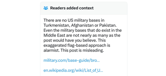 „Nie ma amerykańskich baz wojskowych w Turkmenistanie, Afganistanie i Pakistanie. Nawet baz wojskowych, które rzeczywiście istnieją na Bliskim Wschodzie, nie jest aż tak dużo, jak można by sądzić po wpisie” - czytamy w notatce, automatycznie publikowanej użytkownikom obserwującym konto Muska. „Ten wpis wprowadza w błąd” - podkreślono.