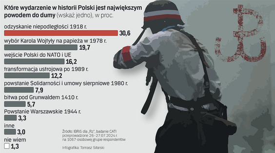 Przy okazji 80. rocznicy wybuchu Powstania Warszawskiego zapytaliśmy Polaków, jakie wydarzenia z historii Polski są największymi powodami do dumy. Z badania przeprowadzonego przez IBRiS na zlecenie „Rzeczpospolitej” wynika, że najwyżej oceniane jest odzyskanie niepodległości 1918 r. (tak wskazało 30,6 proc. badanych), kolejny jest wybór Karola Wojtyły na papieża w 1978 r. (19,7 proc.), następnie wejście Polski do UE i NATO (16,2 proc.), transformacja ustrojowa po 1989 r. (12,2 proc.), powstanie Solidarności, w tym Porozumienia Sierpniowe 1980 r. (7,9 proc.), bitwa pod Grunwaldem 1410 r. (5,7 proc.).