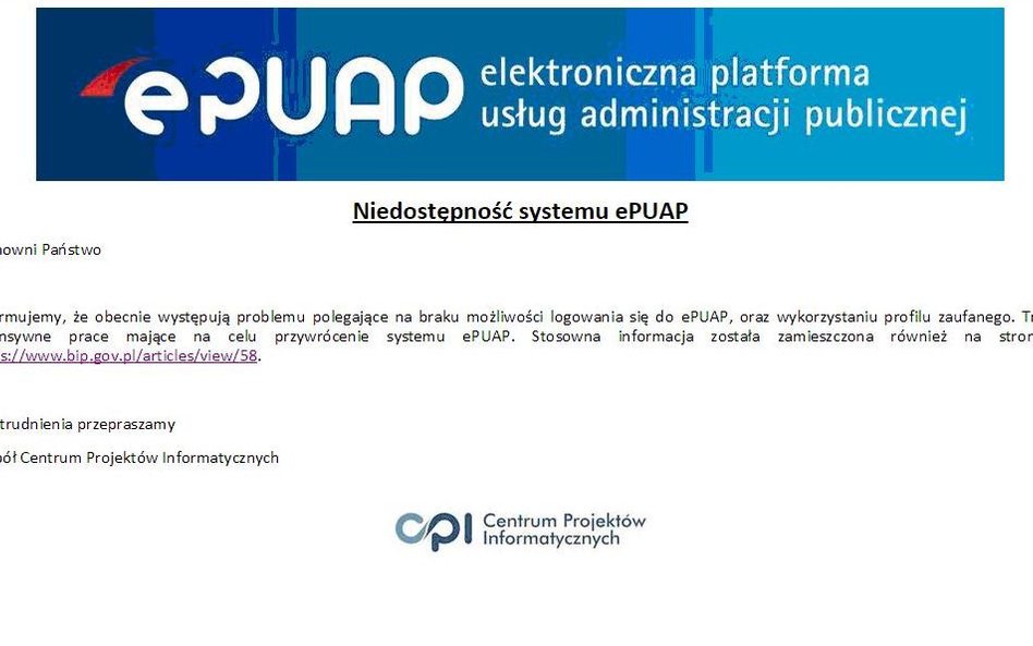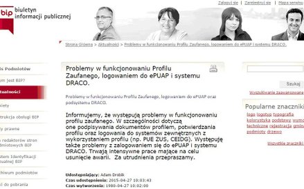 W informacji można było przeczytać, że „występują problemy w funkcjonowaniu profilu zaufanego. W szczególności dotyczą one podpisywania dokumentów profilem, potwierdzania profilu oraz logowania do systemów zewnętrznych z wykorzystaniem profilu (np. PUE ZUS, CEIDG). Występuję także problemy z zalogowaniem się do ePUAP i systemu DRACO".