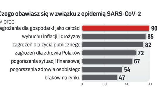 Respondenci oceniali też zagrożenia wynikające z pandemii. Na plan pierwszy wybijają się obawy o gospodarkę jako całość, a także o wzrost inflacji i cen.
