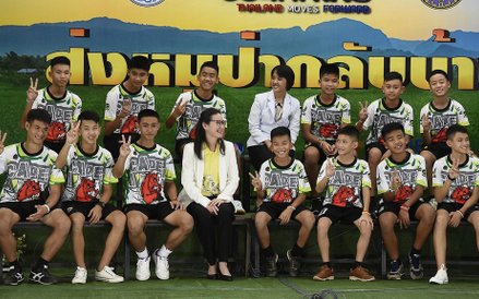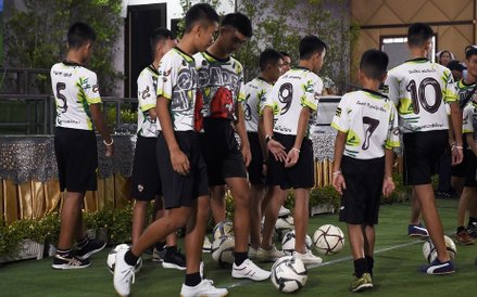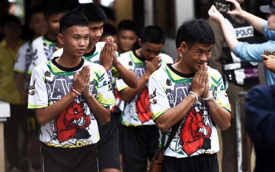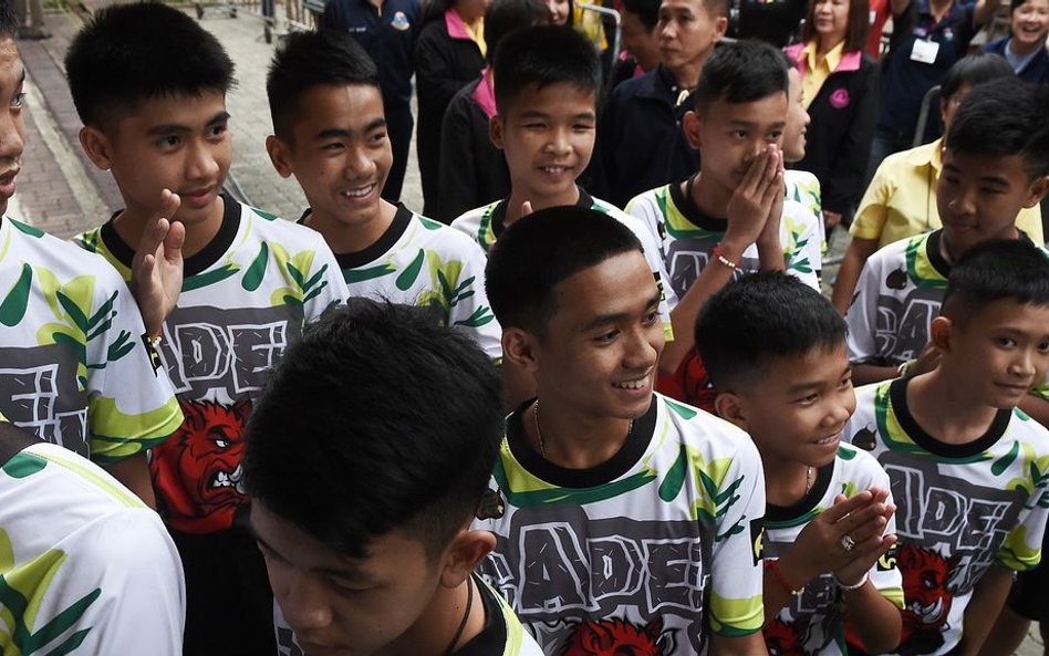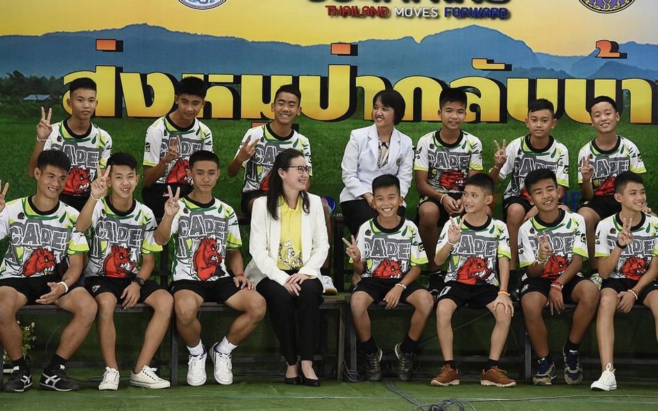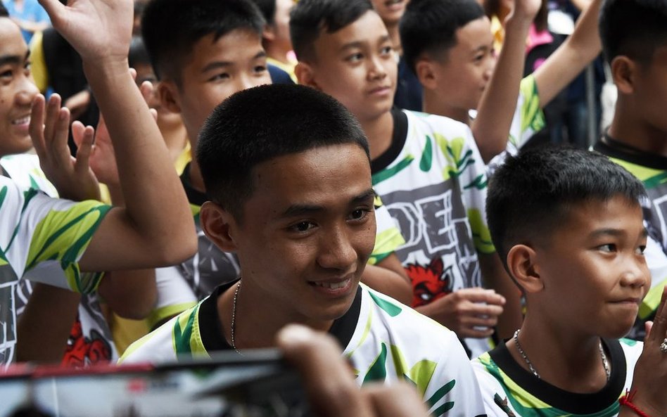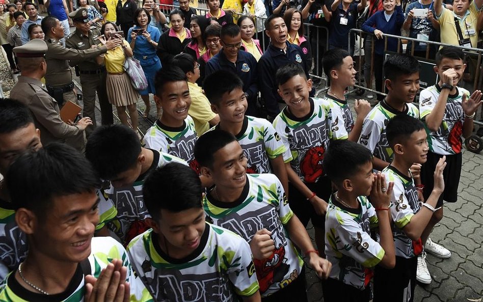 12 chłopców, którzy zostali uratowani z zalanej jaskini, po raz pierwszy pojawili się w środę przed dziennikarzami. Młodzi zawodnicy przed konferencją pasową odbijali piłkę w koszulkach swojej drużyny "Dzikie dziki"