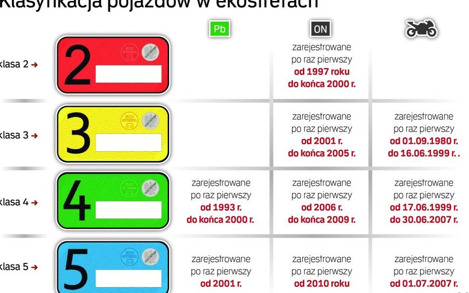 Najgorzej będą mieć posiadacze samochodów z silnikami Diesla. Te, które zostały pierwszy raz zarejestrowane między 1997 a 2001 r., znajdą się w klasie drugiej. Jest to najniższa klasa oznaczona czerwonym kolorem. W klasie trzeciej (żółty kolor) znajdą się auta z silnikami Diesla zarejestrowane pierwszy raz między 2001 a 2006 r., w czwartej (zielony kolor) – zarejestrowane po raz pierwszy od 2006 do 2010 r. Do najbardziej ekologicznej piątej klasy trafią diesle z pierwszą rejestracją od 2010 r.