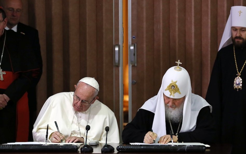 Pierwsze takie spotkanie. Papież i patriarcha Moskwy i Wszechrusi podpisali wspólną deklarację, w której jest mowa o jedności chrześcijan, o konieczności pomocy prześladowanym chrześcijanom na Bliskim Wschodzie i zaniepokojeniu kryzysem rodziny.