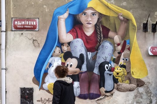Dziecko chroniące pod ukraińską flagą postaci z bajek - to dzieło czeskiego artysty ukrywającego się pod pseudonimem ChemiS