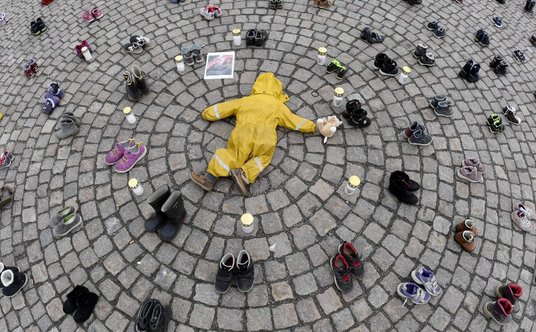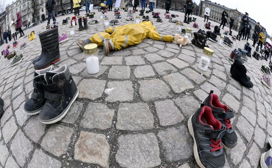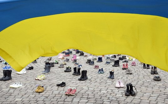 Dziesiątki par butów otaczających ubranka dzieci zostały umieszczone w Helsinkach w Finlandii, aby oddać hołd tym, którzy zginęli w Mariupolu.